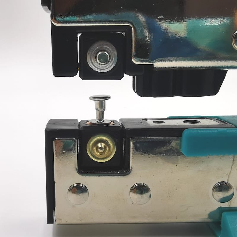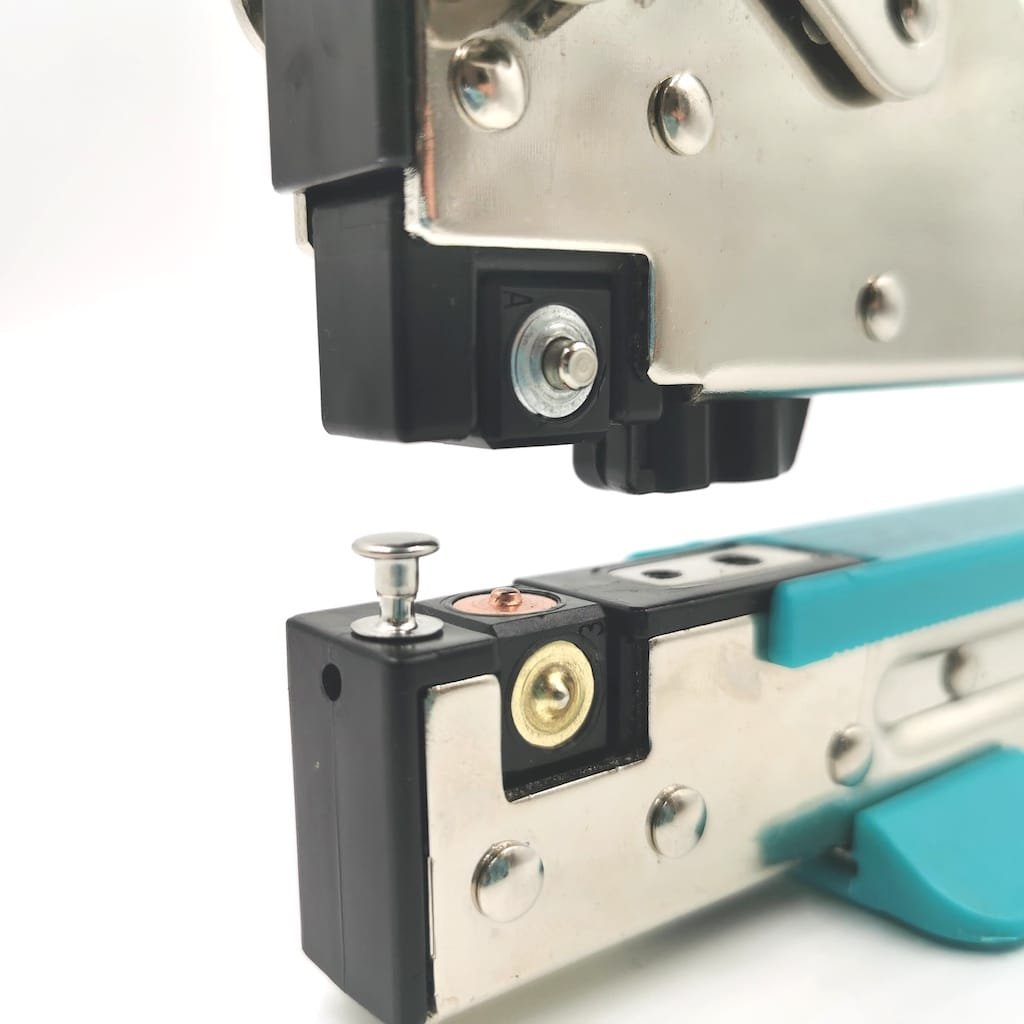 Vorteil bei offenem Unterteil: Die Niete kann schnell und leicht mit der großen Loch- und Ösenzange (WZ1009) verarbeitet werden. Für die Lochung reicht hier die kleine Stanze und für die Nietensetzung braucht es die Einstellung 4B.